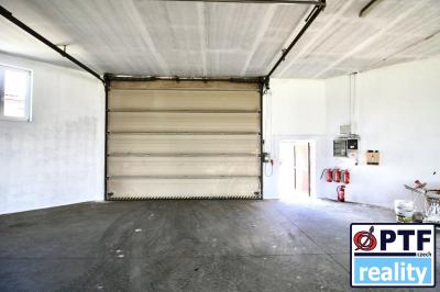 Vjezdová vrata: Zateplená elektrická sekční vrata Hormann (5000 x 3800 mm), vjezd o šířce 5 m a výšce 3,2 m. Přístup po asfaltovém povrchu.